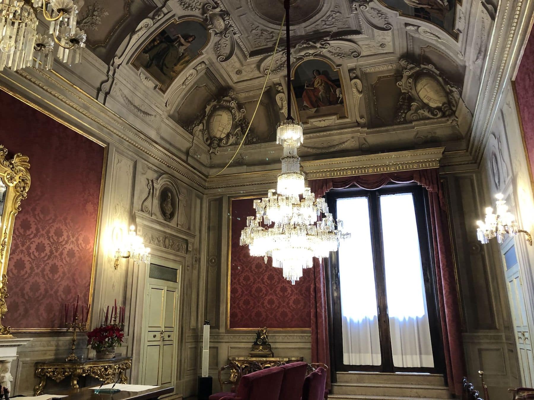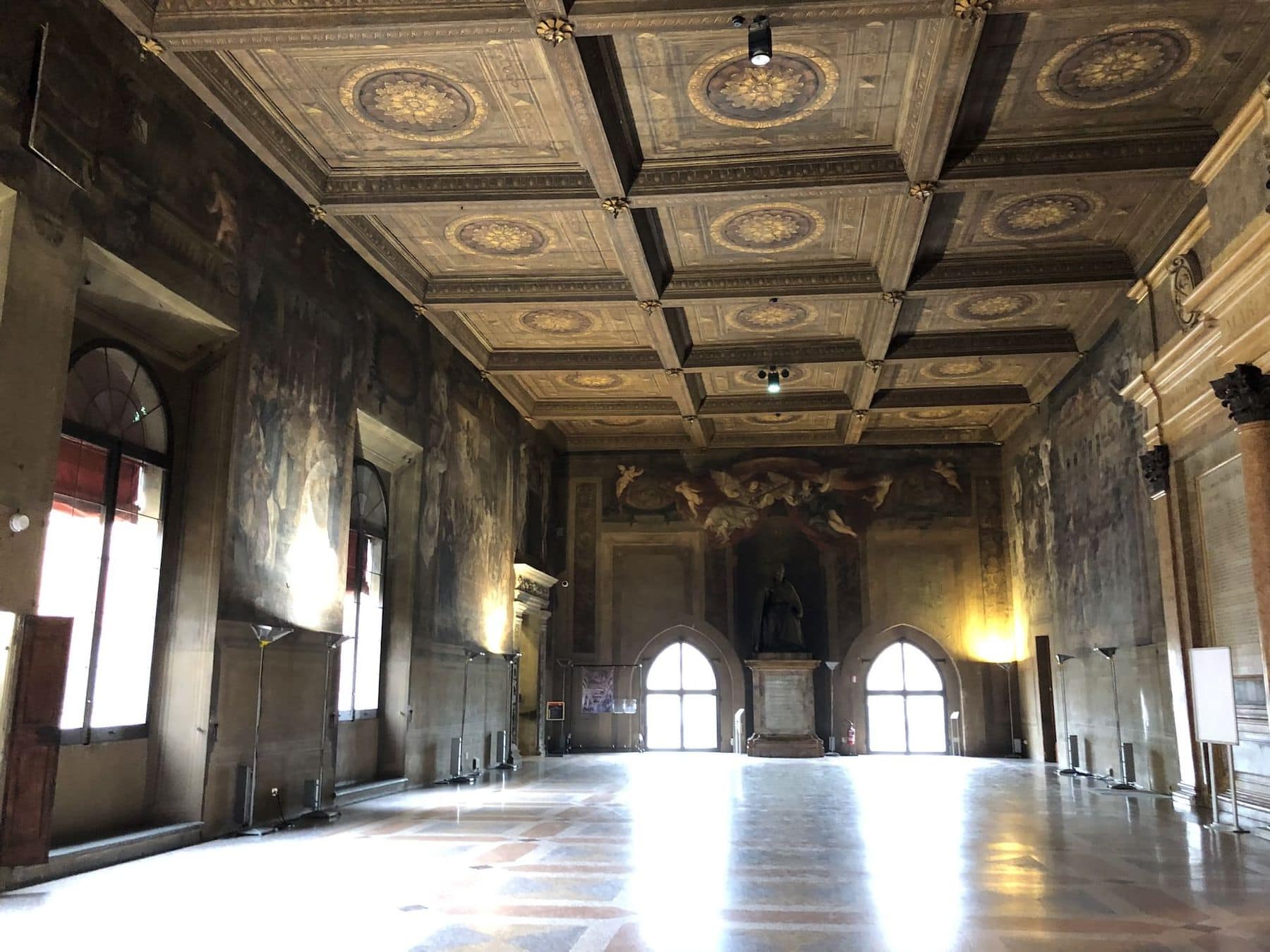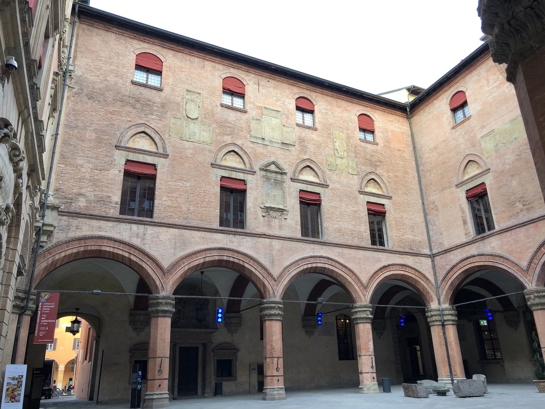 Udover basilikaen, så er der også en anden vigtig bygning på Piazza Maggiore, nemlig Palazzo d’Accursio, der er byens rådhus (siden 1336) og samtidig et museum, som man kan besøge. Som navnet også hentyder til, så var det et palads, der var ejet af en jurist. Bygningen er meget flot, både udvendigt og indvendigt. Når du går ind i bygningen (gennem frontsøjlen som i ser på billedet), så kommer du ind til en meget flot gårdhave, der virkelig illustrerer, at det er et fint palads og ikke bare et kedeligt rådhus (se billedet forneden). Hvis du går ligeud, mod det brune skilt på billedet, så kommer du til en flot plads med en flot brønd og en meget smuk og farverig bygning, der virkelig er en karakteristisk italiensk, historisk bygning med sine søjler og traditionelle vindueskodder (som jeg forøvrigt er helt vild med! – de var over det hele i Bologna). Inde i Palazzo d’Accursio er der smukke vægmalerier og kunstværker, samt smukke, dekorerede rum. Jeg kan specifikt anbefale den store sal (se billede nedenfor) og Sala Rossa (det røde rum), der begge er utrolig smukke. Derudover er der også en kunstudstilling i bygningen, som jeg ikke fik set og derfor ikke kan sige så meget om den. Indgangen til rådhuset er gratis, bort set fra kunstudstillingen, der koster 5 euro.