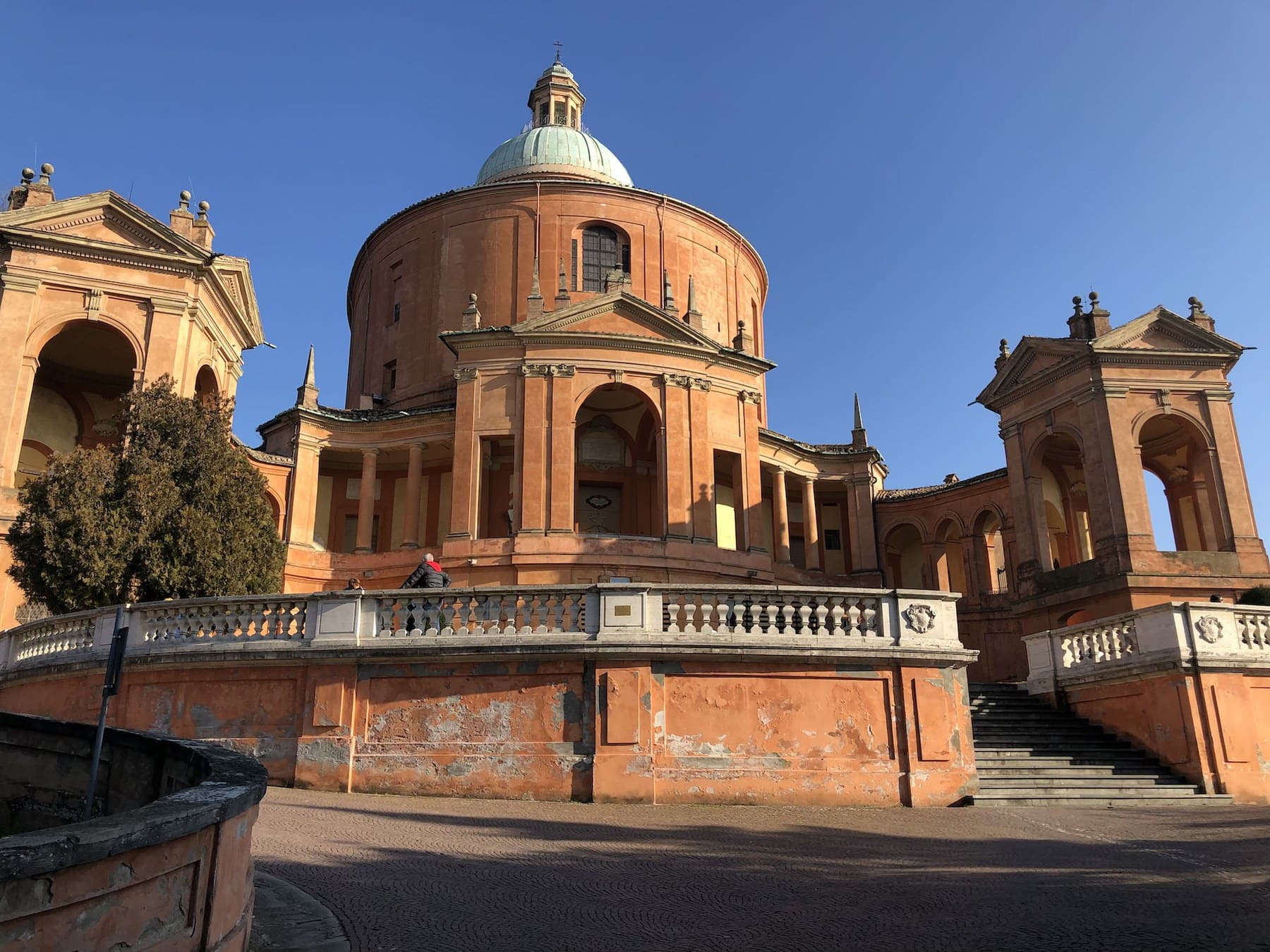 Så kommer vi her til sidst, til mit personlige højdepunkt af seværdigheder i Bologna – ikke kun fordi det er en smuk bygning, men i høj grad på grund af oplevelsen som helhed. Det var en oplevelse, som jeg vil anbefale til jer allesammen. Men for lige at starte ud, vil jeg give et par detaljer om selve bygningen. Det er en kirke, der virkelig har været længe undervejs, før den blev til det, den er idag. Det første spadestik var tilbage i 1194, men den blev først færdiggjort i 1765. Som i også kan se på billedet, så har den en smuk orange/rødlig farve og er virkelig flot bygget med søjlegangene, det runde tårn og indramningerne. Indenfor er den også flot, men ikke noget, der ligefrem vil få jer op af stolene. Stjernen, for mig, er uden tvivl eksteriøret og ikke mindst, den fremragende udsigt. Men hvis vi lige tager et skridt tilbage og kigger på oplevelsen i sig selv, så kan jeg sige, at en stor del af oplevelsen er, at kirken er på toppen af en stor bakke. Der er flere måder man kan komme derop: Du kan tage bilen, tage turisttoget (der koster 10 euro) eller du kan gå derop, ligesom jeg gjorde. Den traditionelle måde at gøre det på, er vistnok at starte fra Porta Saragozza, men jeg startede i stedet fra Arco del Meloncello, hvor den egentlige stig til kirken starter (fortsætter under billeder).