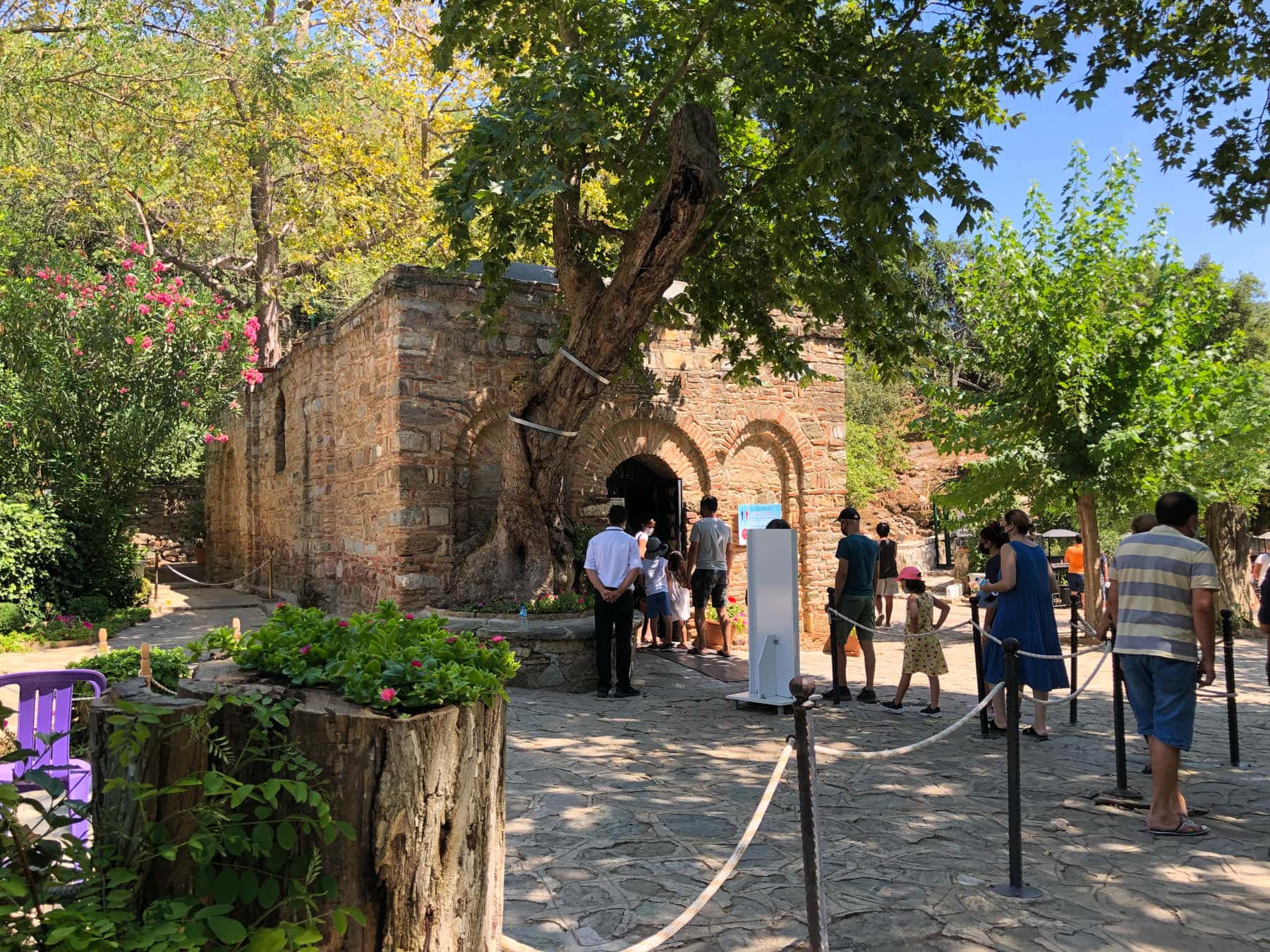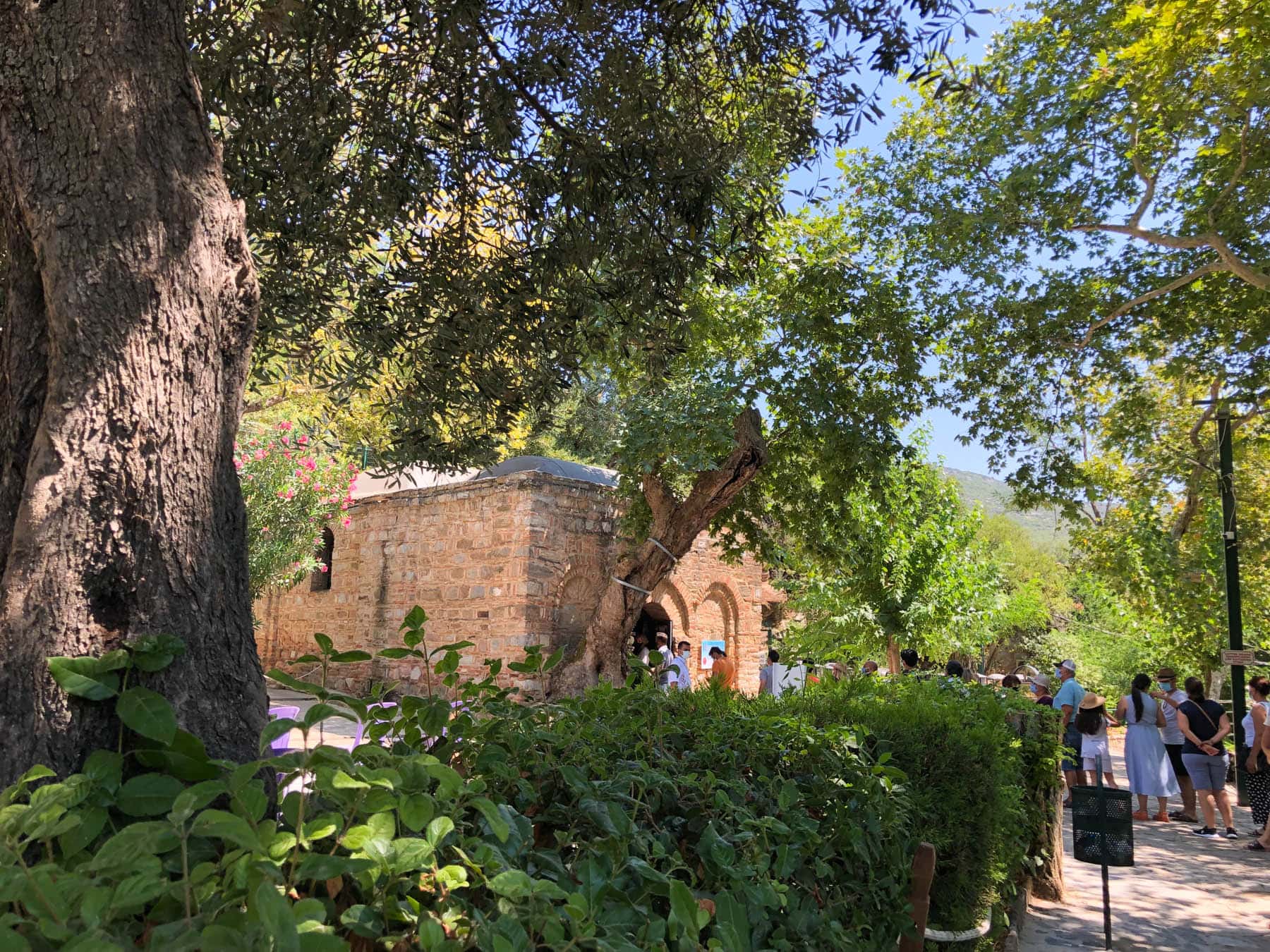 Jomfru Marias hus er en katolsk helligdom, og ligger på en bakke/bjerg, ca. 5 km fra Efesos Arkæologi stedet og ca. 7 km fra Syvsovernes Grotte. Så det er igen rimelig tæt på de øvrige steder, og derfor nemt at inkludere i en samlet tur. Ligesom med Syvsovernes Grotte, så er der uenigheder om autenciteten af huset. Der er ikke nogen konkrete beviser for, om Jomfru Maria rent faktisk har boet her. Derfor har den katolske kirke ikke accepteret husets legitimitet – de har dog heller ikke afvist den. Faktisk så har flere paver besøgt stedet igennem tiden. Men at der er tvivl om husets autencitet forstår man egentlig godt, for det blev først opdaget i det 18. århundrede, og så endda på en ganske besynderlig måde. Husets beliggenhed og eksistens blev først fundet af den tyske nonne, Anne Catherine Emmerich, som var kendt som en mystiker i Tyskland. Hun så en række visioner af Jesus’ sidste dage og Jomfru Marias liv – iblandt disse var visionen om Jomfru Marias hus, hvis beliggenhed hun beskrev i detaljer. I 1881 opdagede en fransk præst så huset, baseret på Emmerichs vision. Men hans opdagelse blev ikke taget seriøst. Men 10 år senere skulle der ske noget igen. Franske Søster Marie de Mandat-Grancey opfordrede to missionærer til at undersøge det, og de endte med at genopdage det. Det forlyder, at Jomfru Marias skulle have levet i huset. Men andre mener også at hun levede i Jerusalem. Ikke desto mindre, så er det i hvert fald et meget fascinerende sted at besøge. Huset er flot bevaret og restaureret, men du kan stadig se, hvor gammelt det er. Det er meget småt, hvilket virkelig kan mærkes, når du er indenfor. Det er kun et lille rum med et kapel af Jomfru Maria og nogle øvrige malerier og artefakter. Det kan være en smule undervældende, især fordi man står i kø og andre venter på en, så man får ikke så lang tid til at betragte stedet. Du går ind, kigger lidt og er ude igen i løbet af 1-2 minutter. Så stedet er lidt svær at sælge til en turist, hvad angår værdi og tid. Men når du kombinerer det med den fascinerende historie, betydningen af stedet, den tætte beliggenhed på Efesos og at indgang kun koster 10 tl, så er det helt klart et besøg værd. Det er tilsyneladende også meget populært, med mange katolske pilgrimme og de lange køer foran indgangen. Stedet er meget fredfyldt og fyldt med frodig natur, hvilket er helt fantastisk.