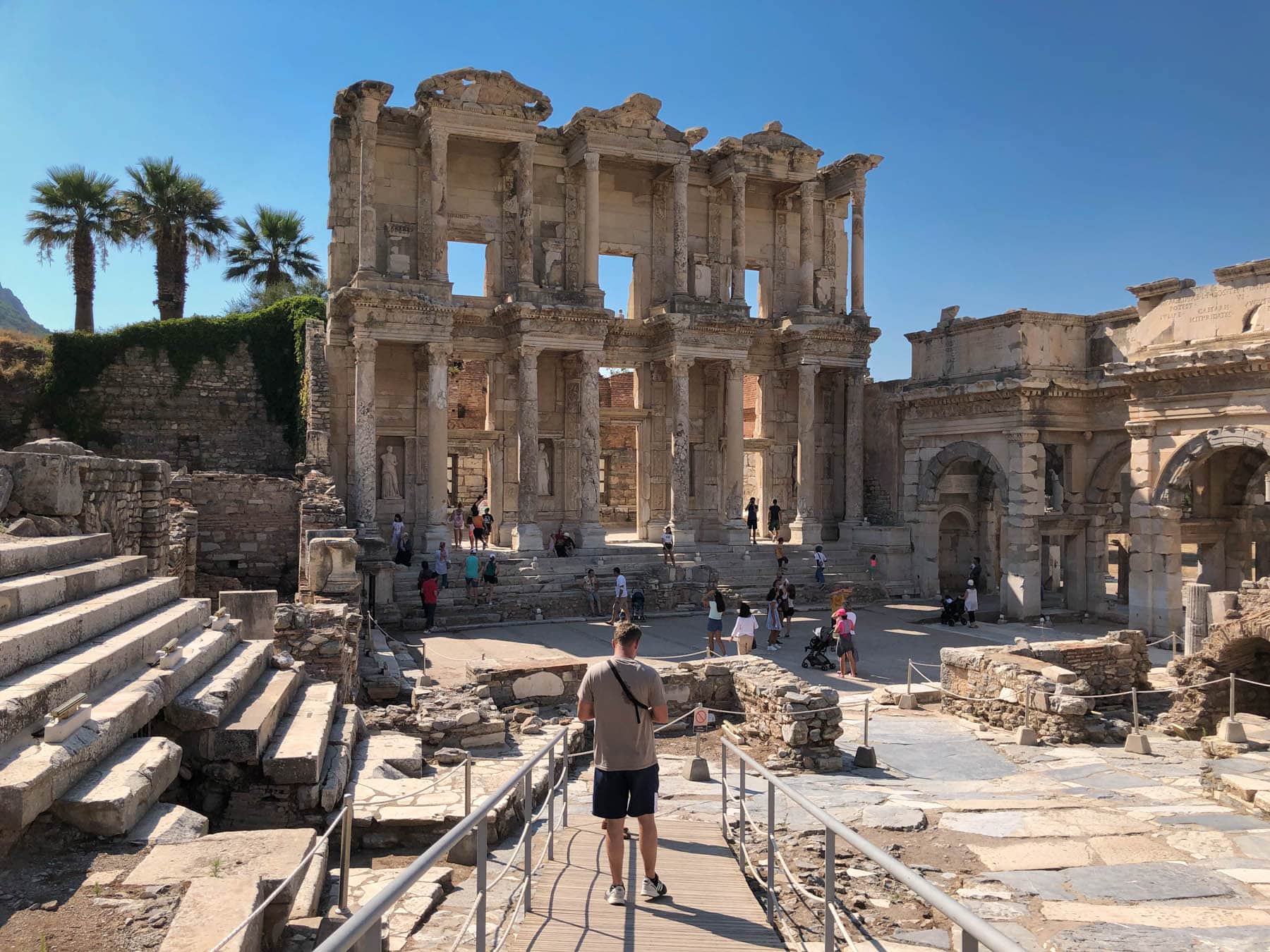 Det var en helt fantastisk oplevelse at se Efesos og de meget velbevarede ruiner her. Området var kæmpestort og der var en hel masse fantastiske værker. Det er uden tvivl en af de største og mest omfattende antikke byer, jeg har besøgt. Jeg tror vi brugte to timer derinde, og vi var relativt hurtige og så heller ikke hele grunden, da vi var derovre på en super varm sommerdag, midt på eftermiddagen. Så vi blev hurtigt udmattede og tørstige – vi kogte nærmest 😅 Så jeg kan helt klart anbefale, at man kommer på et mere passende tidspunkt end vi gjorde, og husk en masse væske og måske en hat. Når du er derinde bliver du nærmest transporteret tilbage i tiden, for alle værkerne er super godt velbevarede og der er så mange, at du nærmest ikke ved, hvad du skal starte med eller hvor du skal kigge. Her kan du finde kæmpestore amfiteatre, detaljerede søjler og statuer, romerske bade, flotte gader og vigtige, historiske landemærker som fx Artemistemplet og Celsus’ bibliotek (se billederne af det nedenfor). Sidstnævnte er uden tvivl den største og mest ikoniske attraktion i Efesos. Det er en af de få tilbageværende eksempler på et bibliotek fra Romerriget, og var det 3. største bibliotek i riget med hele 12.000 skrifter og 180 m², Du bliver virkelig tryllebundet af dets vidunder, når du ser den ekstremt smukke og detaljerede facade. Den høje marmorfacade er fyldt med bittesmå finurlige detaljer og indgraveringer, b.la. symboler af blade, skrifter, emblemer, søjler og statuer af kvindelige personificeringer af dyder (visdom, intelligens, viden og fortræffelighed).