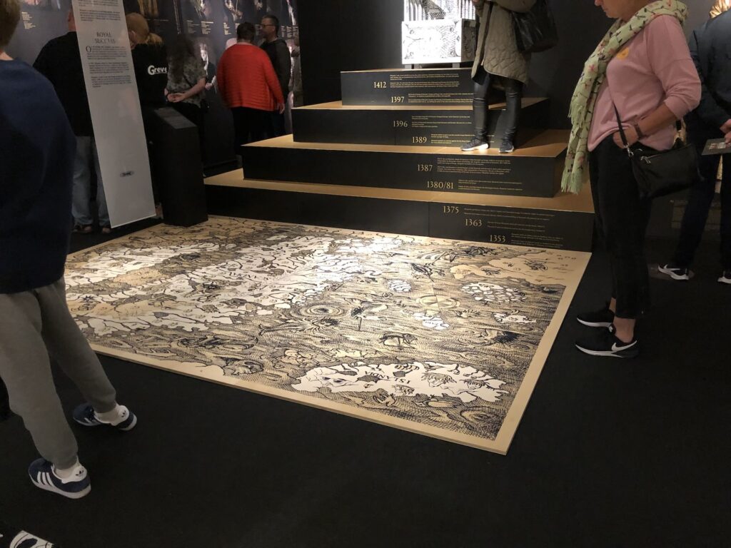 Indvendigt er der som nævnt, inkorporeret en del moderne elementer, så det føles ikke altid som om du går i et 750 års slot, så det skal man lige have i mente inden man besøger slottet. Når det så er sagt, så er der stadig en del tilbage fra den originale bygning og en masse andre spændende ting, som man kan opleve i slottet. Slottet er også et museum, hvilket betyder, at der her er forskellige interessante udstillinger – nogle er permanente, mens andre er skiftende. Der er bl.a. en flot smykkesamling, Statens Kunstfonds Smykkesamling, som byder på 300 smykker fra danske smykkekunstnere. Da jeg var der, var den helt store udstilling “Kongerækken med Jim Lyngvild”, der i skrivende stund stadig er kørende. Det var en virkelig spændende udstilling, som indebærer smukke kostumer designet af Jim Lyngvild, spændende historier og fakta om kongerækken og ansatte, der klædte sig ud som de royale og fortalte historiske episoder med en masse indlevelse og humør, hvilket var meget fedt! De var heller ikke sky for at besvare spørgsmål – de besvarede dem utrolig grundigt og med passion og dybde. Går vi tilbage til slottet i sin helhed, så er det virkelig stort og har SÅ mange værelser og rum, at du kan bruge meget lang tid derinde. Der er flere etager og inddelinger, så der er rigeligt at se og udforske. Hvis jeg skal komme med en lille kritik, så kunne jeg godt tænke mig lidt mere orden og struktur igennem slottets indre. Jeg savner især nummerering, så man ved hvor man skal starte og slutte. Manglen på dette gør selvfølgelig at man nemt kan misse steder i slottet og komme til at sprænge dem over.
