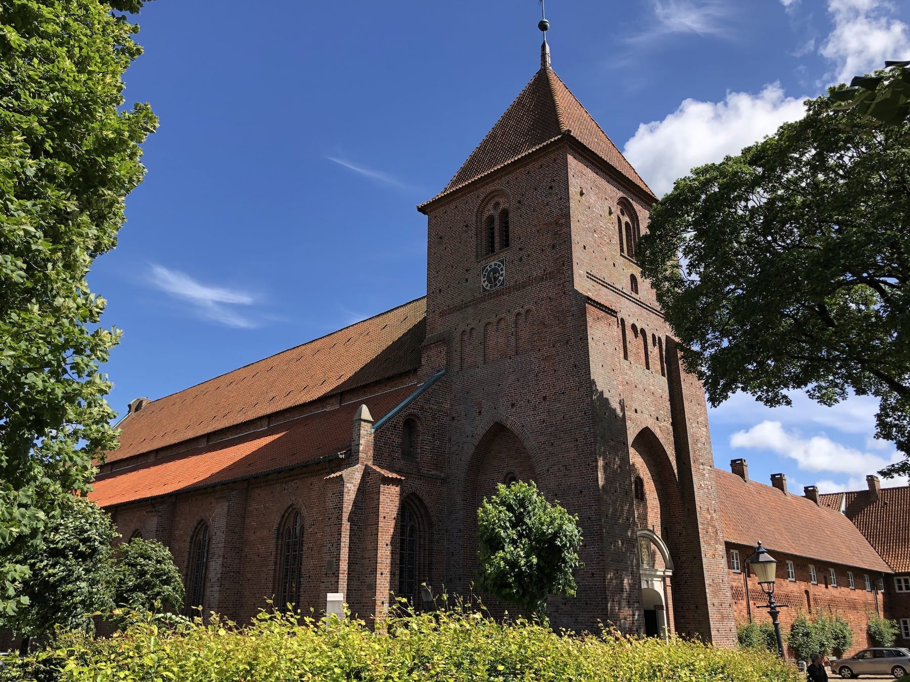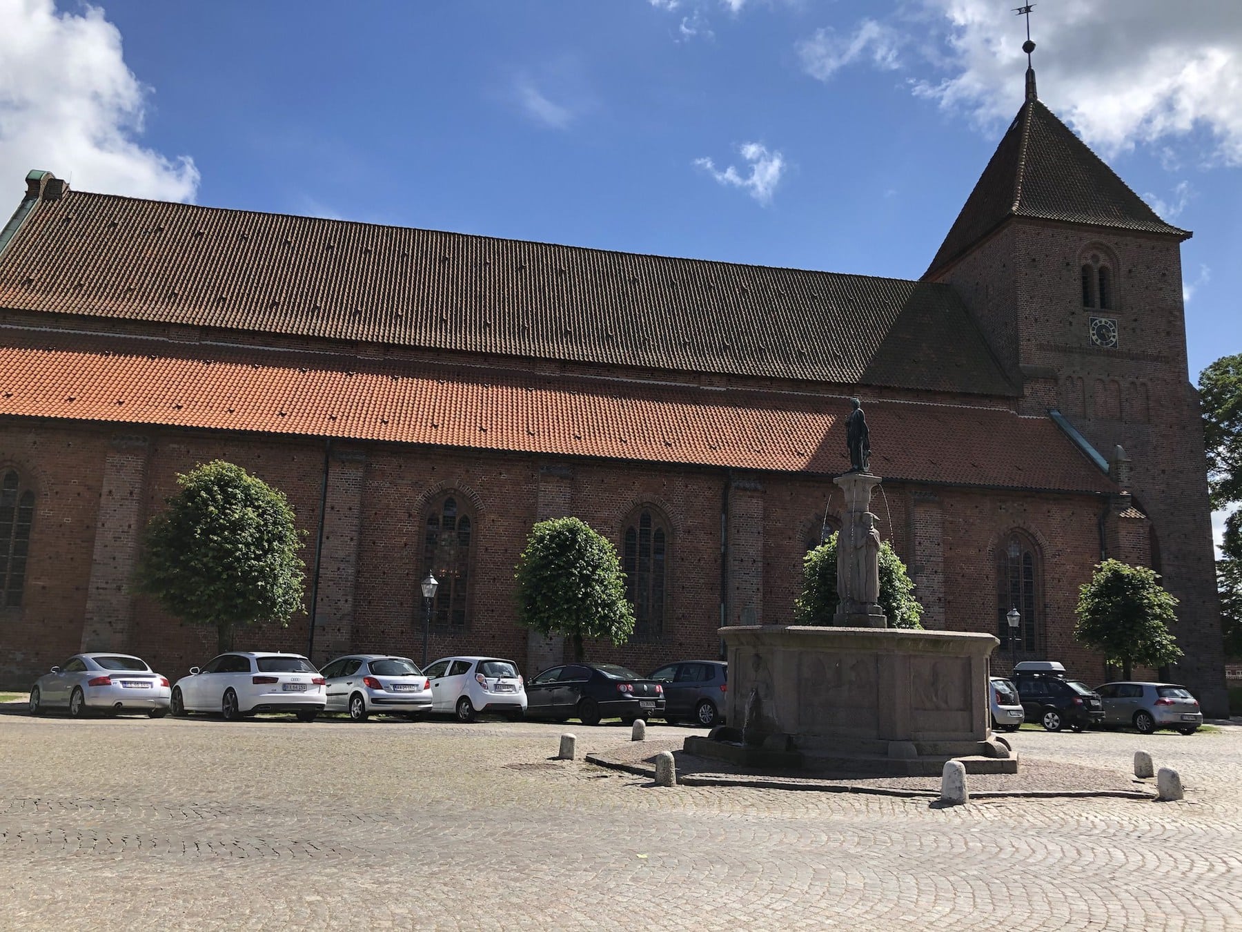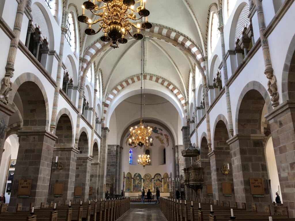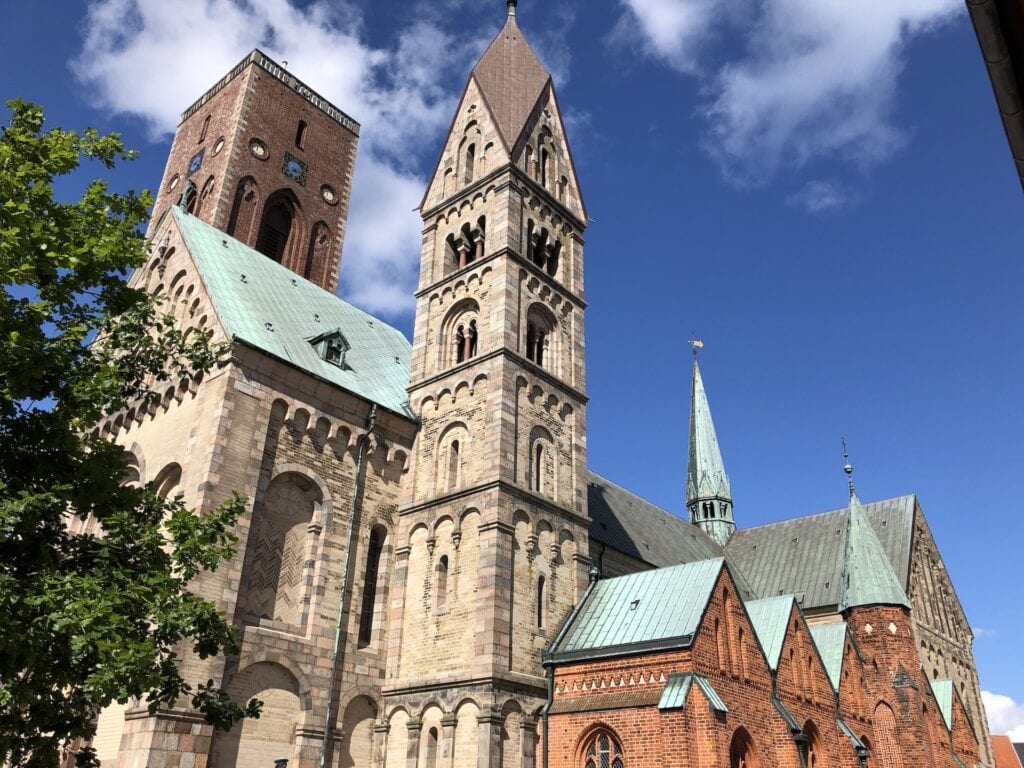 Ribe Domkirke blev opført i 1100-tallet og bliver anset som den bedst bevarede romanske domkirke i Danmark. Men den ser en smule spøjs ud, set udefra, da den indebærer mange forskellige stile – dette skyldes de mange tilføjelser og ombygninger igennem dens turbulente historie. Indvendigt er den meget stor og imponerende. Men der er ikke særlig mange malerier osv. ( som er normalt i romanske kirker), da man valgte at male væggene hvide under reformationen. Kirken har 3 tårne – Rytterspiret, Mariatårnet og Borgertårnet. Sidstnævnte kan op af og opleve en fantastisk udsigt over Ribe. Det er 50 meter højt og er det mindste af tårnene. Men der er dog 248 trappetrin op til udsigtsplatformen, hvilket er rimelig lang tur, må jeg sige 😅Så det skal man lige være varsom med. Det er gratis at komme ind i kirken, men det koster 20 kr. at komme op i tårnet, som dog er godt betalt, uden tvivl! Vær opmærksom på, at kirken lukker allerede kl 16, også om sommeren.
